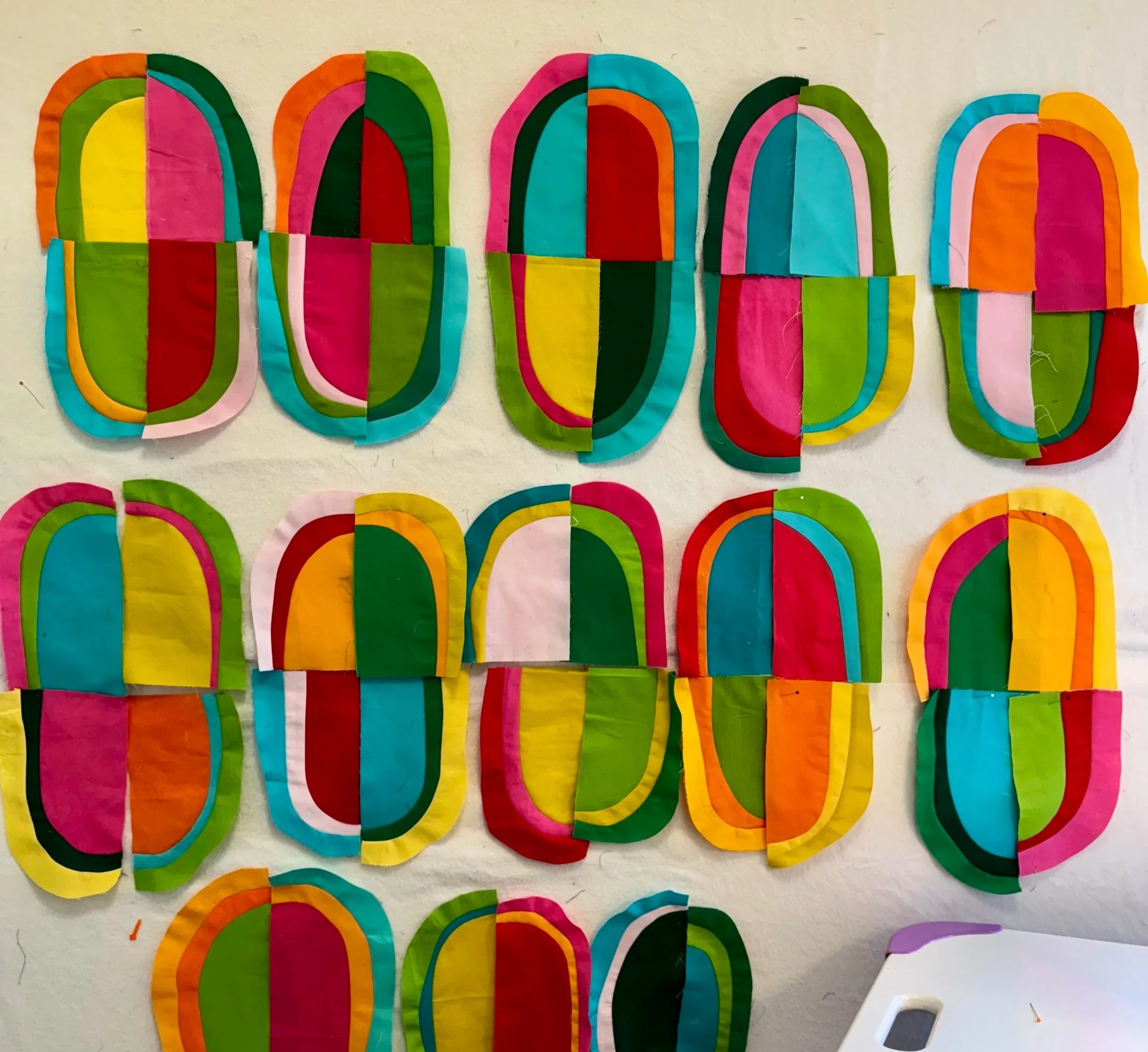 In many traditional quilt designs built from repeated blocks, a motif naturally reads as the foreground, while a single—often neutral—fabric functions as the background or negative space. While this convention doesn’t apply to all of my work as a modern, improvisational quilter, there are times when a clear relationship between foreground and background emerges. That’s the case with this quilt in progress. As I pieced these motifs together, I had a fairly clear vision: I imagined them set against a neutral grey background. From years of hands-on experience and study of color theory, I know that a mid-toned grey can support colorful motifs without competing with them. Unlike white, which can wash colors out, or black, which can create high contrast and visual drama, a mid-tone grey tends to allow colors to relate to one another more naturally.