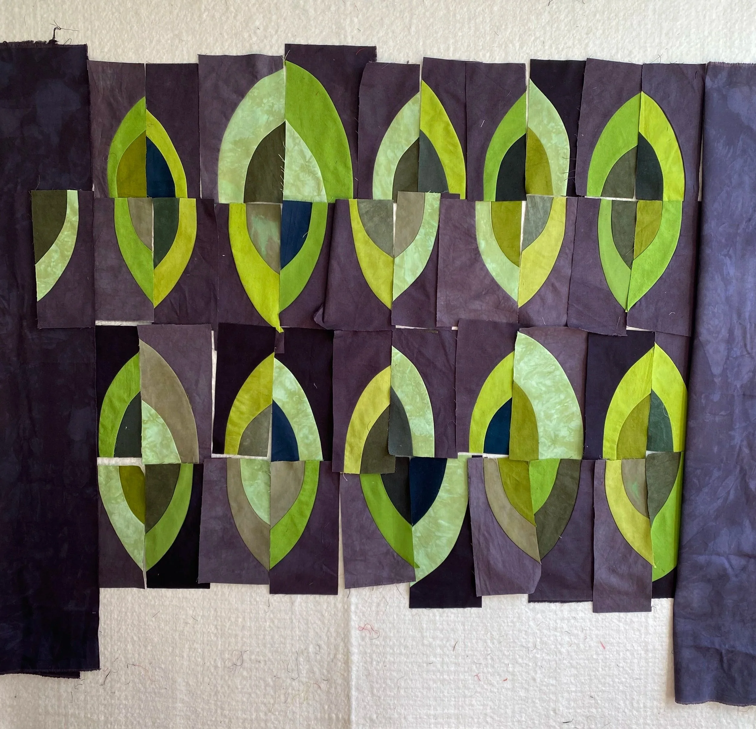 I began by auditioning fabrics from my stash—several neutrals and even a print—placing them behind the motifs on my design wall. Through this process, I confirmed that I preferred a mid- to dark-toned grey with a warm undertone. However, I didn’t have nearly enough yardage of any single fabric, which meant I needed to consider my next steps: purchasing additional fabric, hand-dyeing yardage, or using a range of fabrics to introduce another design element into the background.
